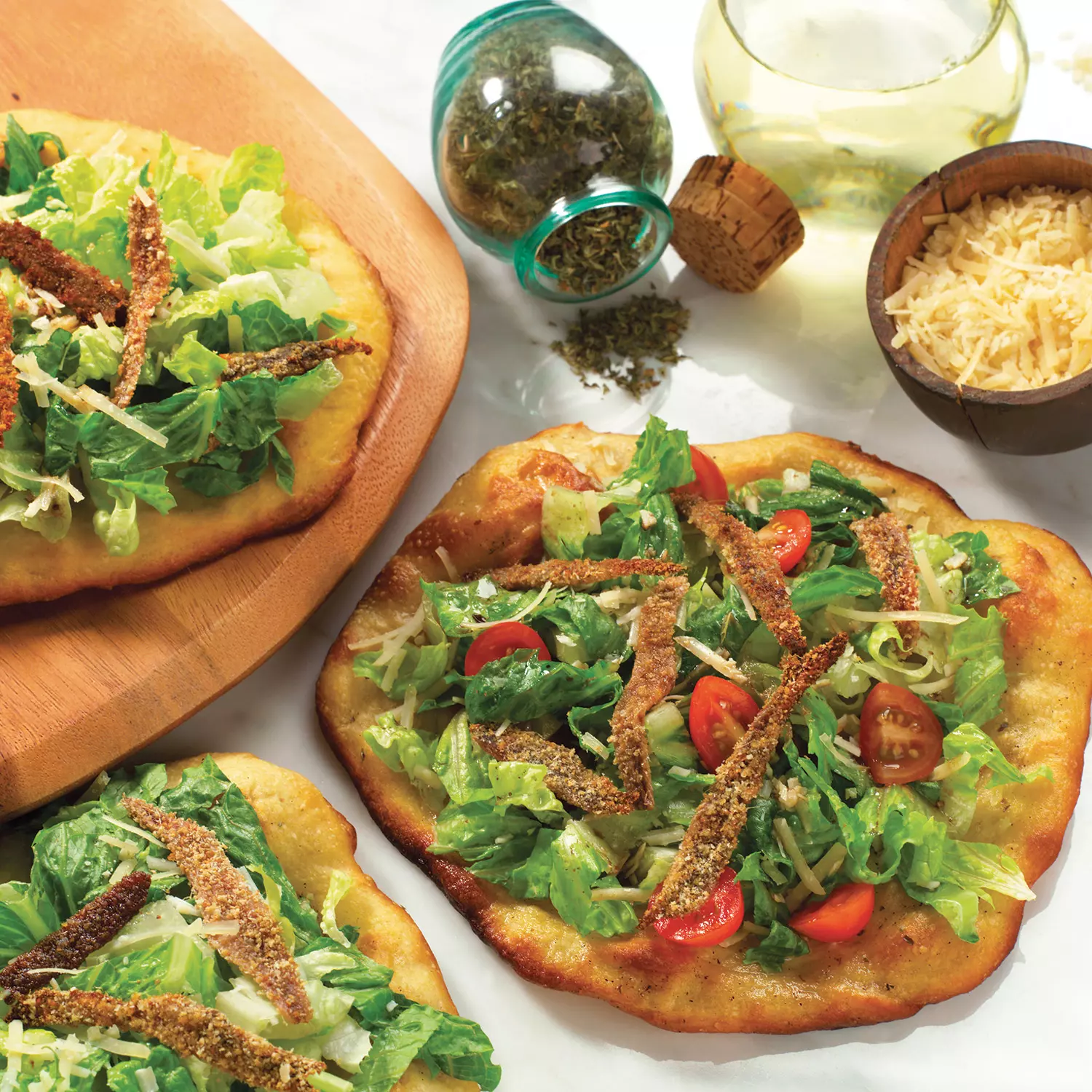 - In a large bowl, mix chopped lettuce and Caesar dressing. Top each focaccia with desired amount of tossed salad, breaded anchovies, cherry tomatoes and Parmesan cheese.