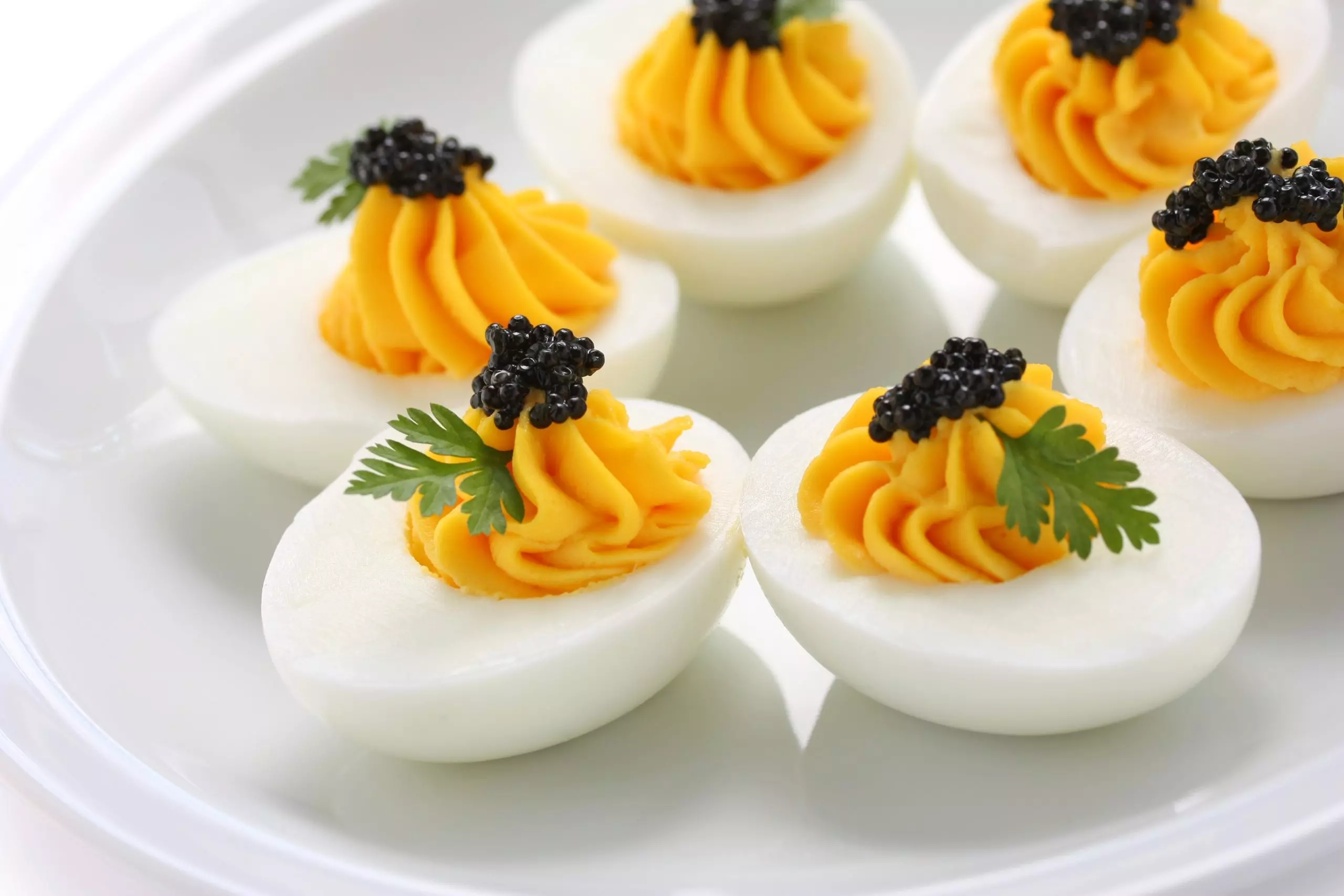 - Spoon yolk mixture back into the egg whites. Top each deviled egg with a spoonful of Season Caviart® and parsley sprig.