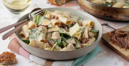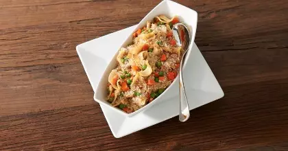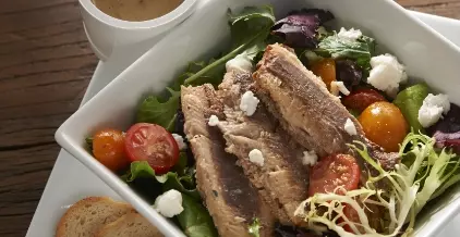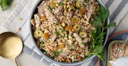 Mackerel Farro Salad with Pine Nuts, Golden Raisins, and Olives