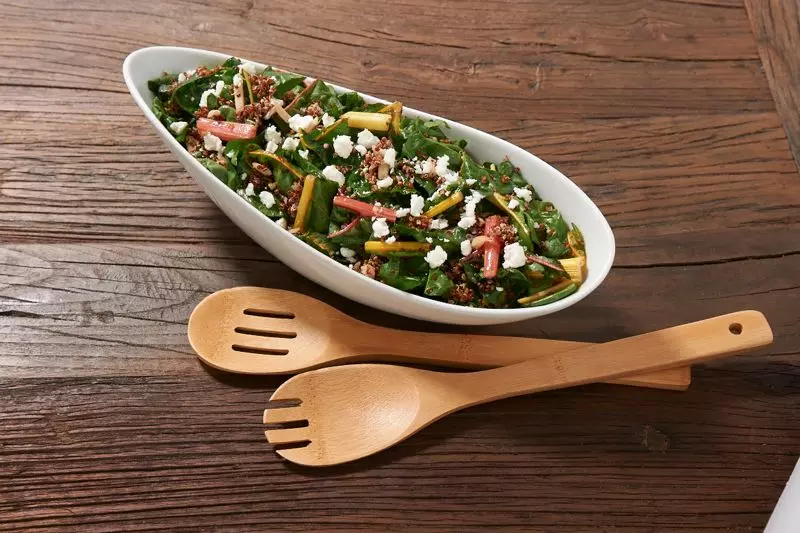 - In a medium mixing bowl, combine dressing ingredients. Add chard to dressing mixture and toss.
