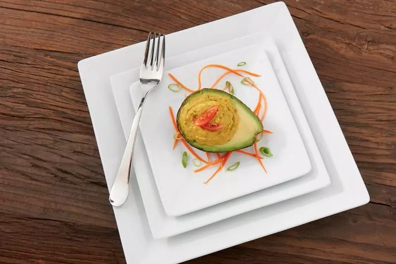 - Cut the avocados in half, take out pit and with a spoon, scoop most of the flesh into a medium mixing bowl.