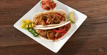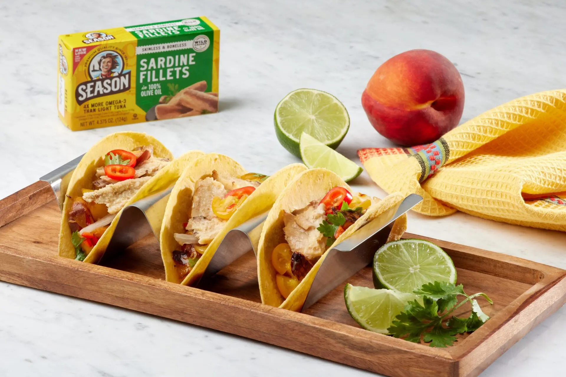 Sardine Tacos with Charred Stone Fruit Salsa & Caramelized Onions